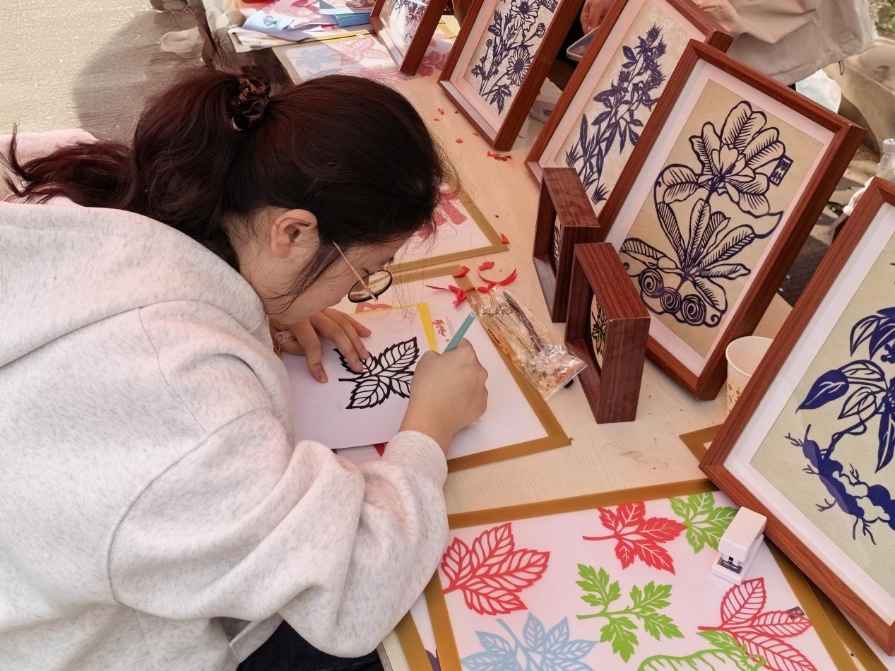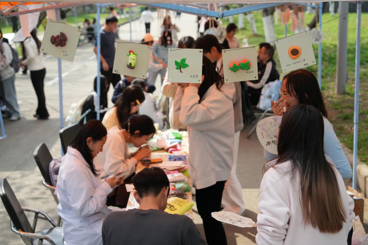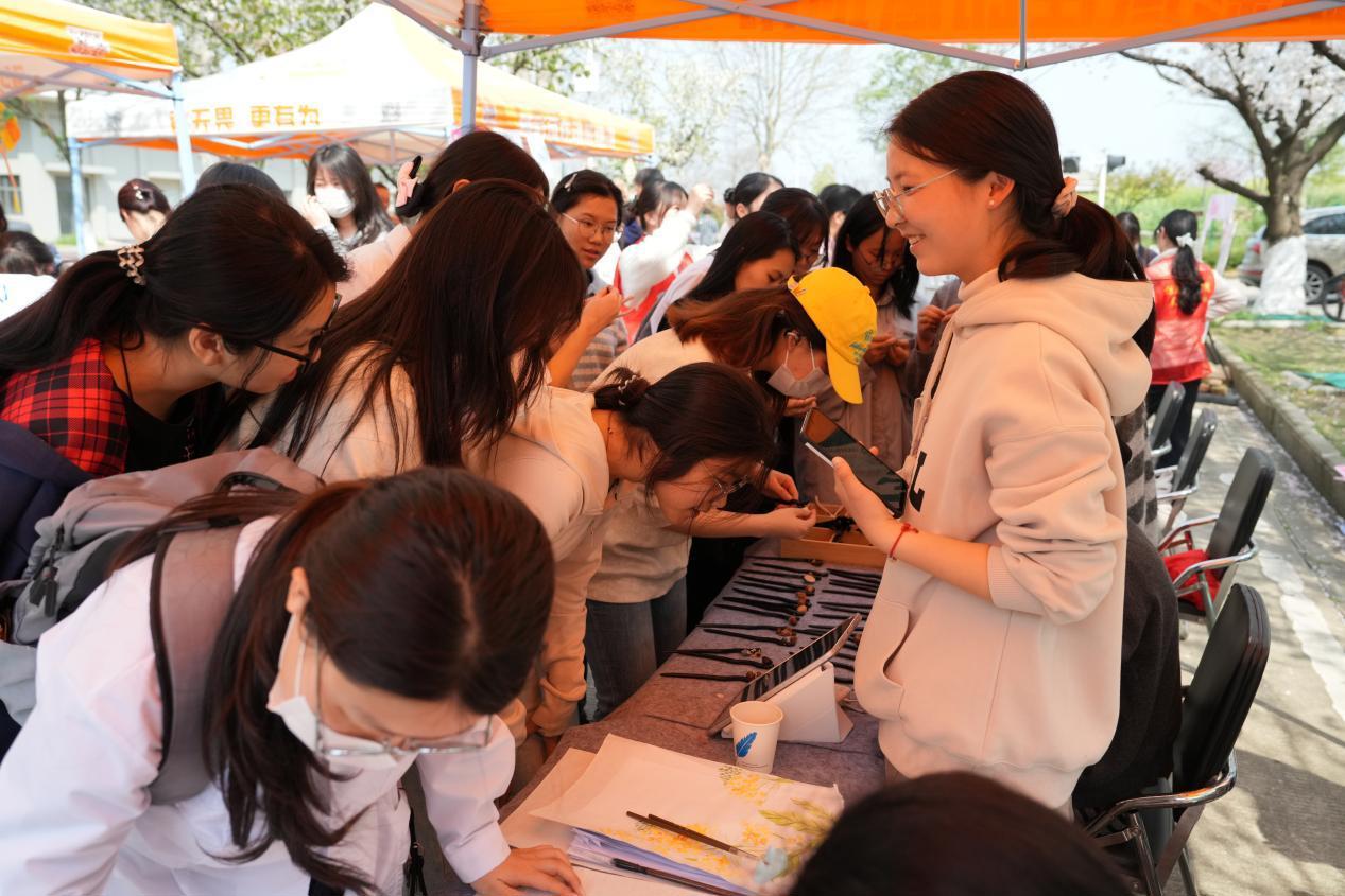 不远处,中医学院的展台前,学生们将药材辨识与黏土手工结合,揉捏出一枚枚栩栩如生的“草药模型”;药学院的“剪纸裁春”吸引了不少人驻足,剪刀游走间,金银花、蒲公英等本草形象跃然纸上;管理学院推出的中药底纹漆扇点染体验区,师生以漆为墨,在印有草本元素的扇面上自由挥洒;护理学院则通过古风发簪手作、本草主题国画创作,让传统美学在指尖流淌。