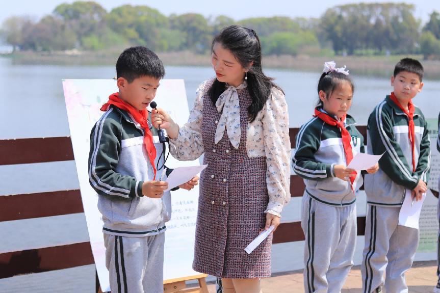 正是桃花水时节,4月1日上午,武汉市光谷第八小学(下文简称“光谷八小”)四年级的学生来到马鞍山脊、喻家湖畔,现场学习语文课文《三月桃花水》。