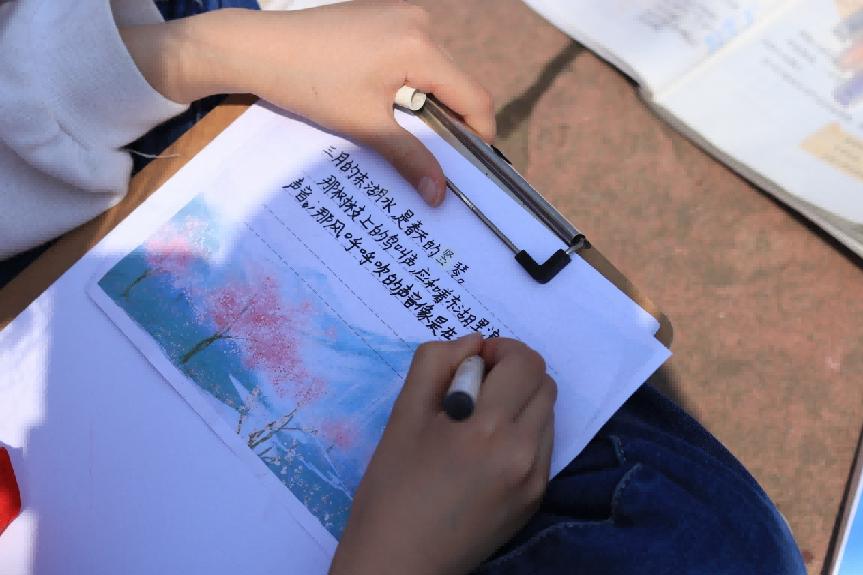 这堂贴近实景的春日课堂,是当天上午“湖山问春”主题的自然健康课程的收尾。在此之前,孩子们已经陆续上了体育课、心理课和科学课,在自然场景中完成运动、放松与观察,再回到文本,把真实体验和课文内容连在了一起。