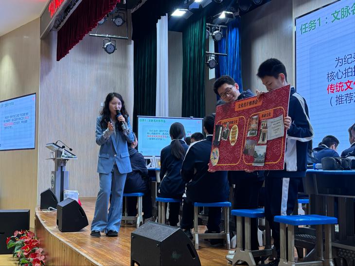 在复习示范课环节,南湖中学陈佩老师以长江文化为脉络,紧扣长江大保护十周年时代背景,将生态保护、法治观念、文化自信、家国情怀有机融合。以纪录片《新时代长江之歌》遴选核心拍摄素材为主线,设置文脉名片推荐会、江畔禁渔情景剧、发展听证思辨会三大分层任务,AI技术成为课堂点睛之笔:动态可视化呈现长江生态变迁图景,实时生成多元法治情境案例,智能生成并展示学生创作成果,学习探究过程充满想象力。