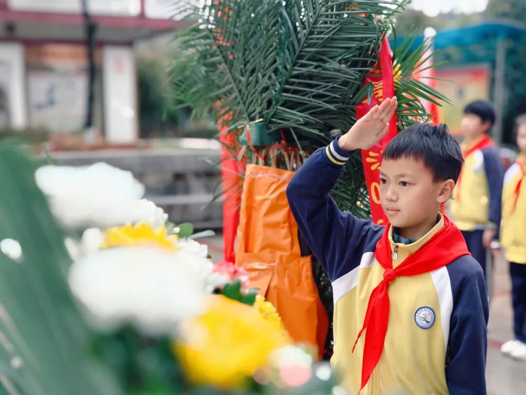 他们身着整齐校服,亲手折制纸菊花,在烈士纪念碑前郑重献花、肃立默哀,以质朴方式寄托对先烈的深切缅怀。