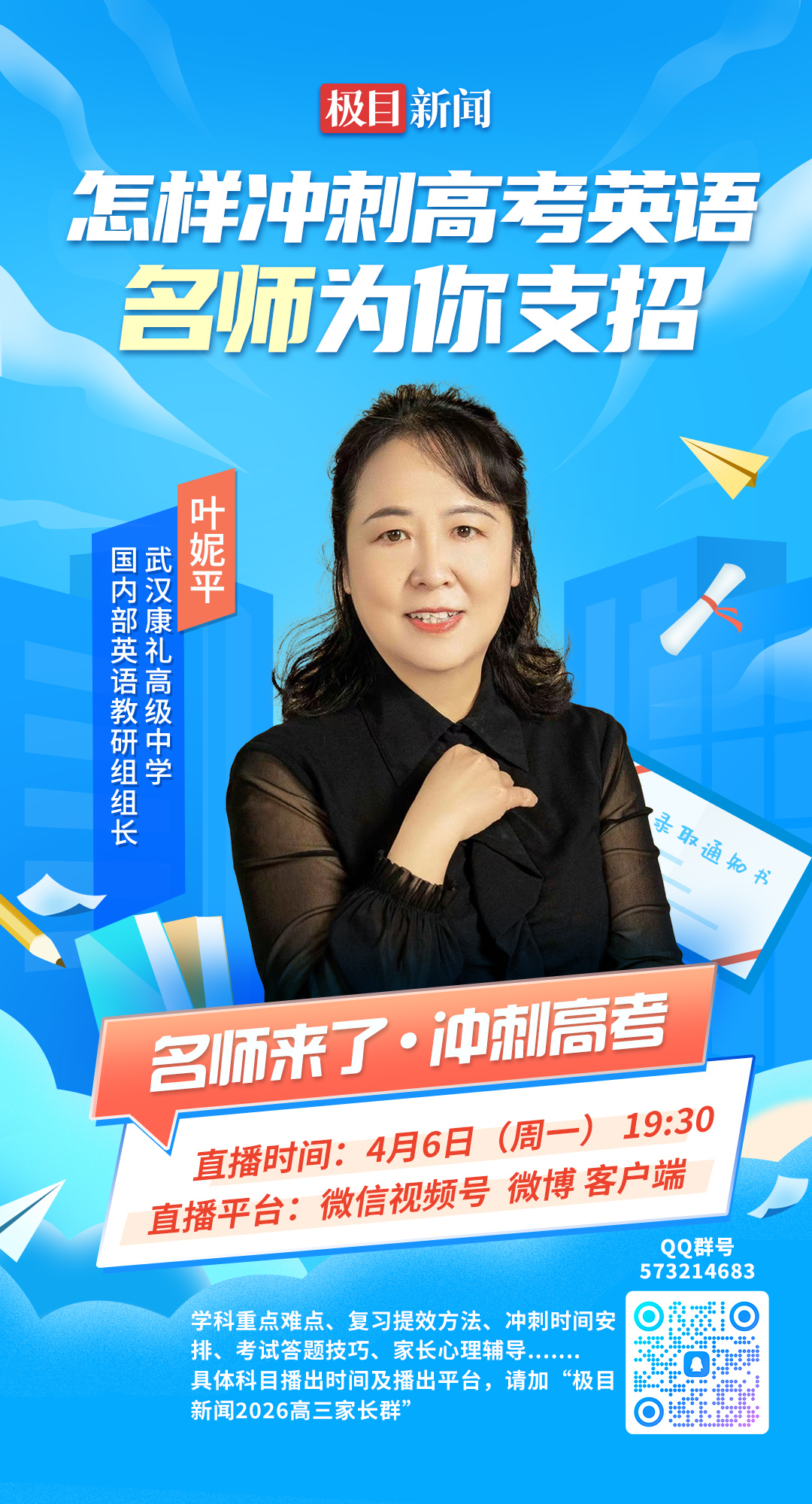 4月6日(周一)19:30,新闻“名师来了・冲刺高考”系列公益直播重磅来袭!本次特邀武汉康礼高级中学国内部英语教研组组长叶妮平老师做客直播间,为广大考生和家长带来英语冲刺复习攻略。