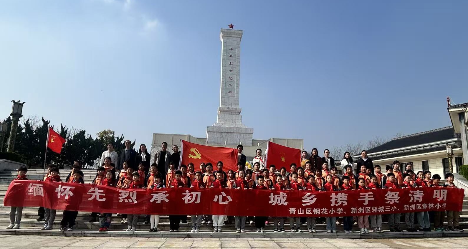 今年是中国共产党成立105周年、红军长征胜利90周年,武汉市青山区钢花小学积极响应四部门联合部署开展的“追寻·2026·清明祭英烈”活动。正值清明节,武汉市青山区钢花小学少先队联合结对学校新洲区邾城三小少先队、章林小学少先队,组织60名少先队员代表前往新洲区徐古街红色广场,开展“缅怀先烈承初心 城乡携手祭清明”清明节主题祭扫活动,用实际行动追思革命先烈,致敬英雄精神。