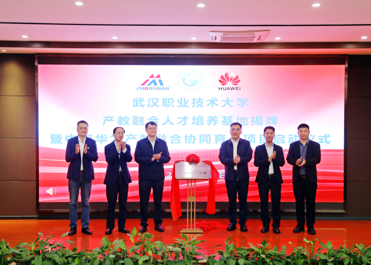 4月3日,武汉职业技术大学产教融合人才培养基地揭牌暨中南华为产教融合协同育人项目启动仪式顺利举行。武汉职业技术大学校长何保华,中南人才集团总裁张文涛,华为机器有限公司裴部长出席仪式并共同为基地揭牌。