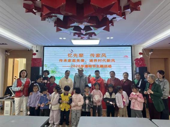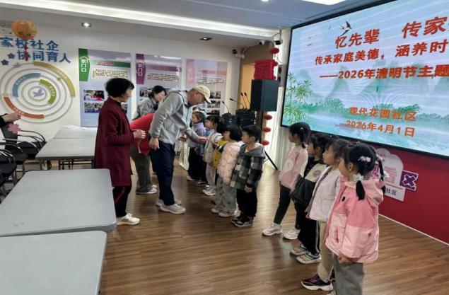 “奶奶,老师说清明要怀念先辈,还要把家里的好家风传下去,对吗?”小朋友仰着红扑扑的小脸,拉着社区李奶奶的手,眼神格外认真。“没错呀宝贝,咱们要记住先辈的好,把好品德一代代传下去!”李奶奶轻轻抚摸着孩子的头顶,满脸慈爱。一旁的家长代表笑着补充:“在家我们也常和孩子讲家风故事,没想到在社区能有这样的实践机会,太贴心了!”近日,武汉市青山区第一幼儿园现代园大班组携手社区、联动家长,共同开展清明主题联谊活动。孩子们带着童真走进社区,在幼儿园老师的引导、社区工作人员的陪伴、家长的鼓励下,主动鞠躬问好、与居民温情互动,用稚嫩行动传递清明温情与优良家风,让家校社协同育人的温暖力量看得见、摸得着。