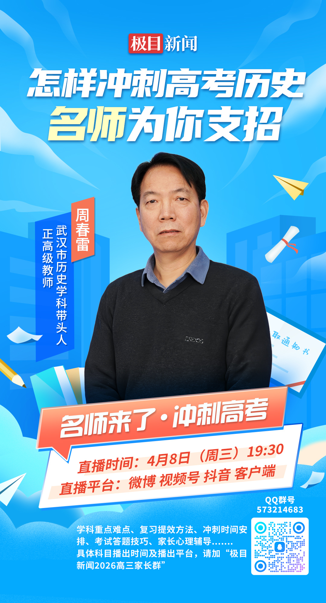 4月8日19:30,新闻“名师来了・冲刺高考”系列公益直播重磅来袭!本次特邀武汉市历史学科带头人、武汉市第三中学教师周春雷走进直播间,为广大考生和家长带来历史冲刺复习攻略。