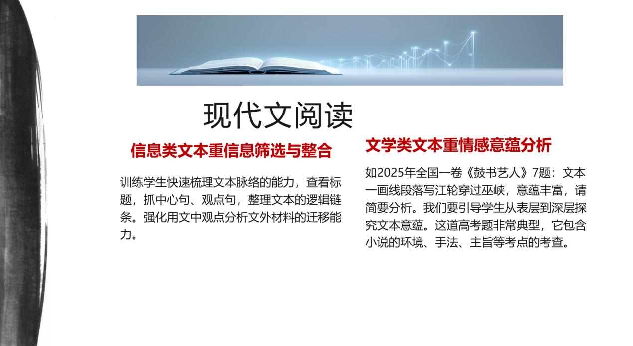 阅读模块是提分关键,需立足“读懂文本”。现代文阅读中,信息类文本侧重信息筛选与逻辑梳理,要抓住标题、中心句、观点句理清脉络,强化用文中观点分析新材料的迁移能力;文学类文本需从表层内容到深层主旨,结合环境、手法、主题综合解读,做到举一反三。文言文阅读可采用 “先读第12题选项、借助题目解文”的方法快速理解文意,结合语境突破断句、实词难点,坚持朗读积累字词培养语感。诗歌阅读作为难点,可通过景物分析法抓景与情、章法手法分析法用起承转合破题、情感溯源法结合作者与典故理解情感,同时需警惕诗句理解错误的陷阱,逐句精准辨析。