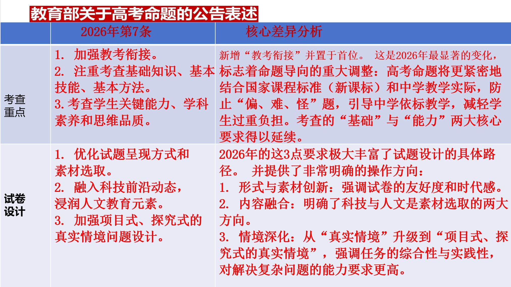 姜冬霞指出,2026年高考语文命题最显著变化是将“教考衔接”置于考察重点首位。命题将紧密贴合国家课程标准与中学教学实际,杜绝偏难怪题。同时聚焦基础知识、基本技能、基本方法的灵活运用,不搞超纲考查,更强调能力、素养与思维品质,突出真实情境下的问题解决能力。