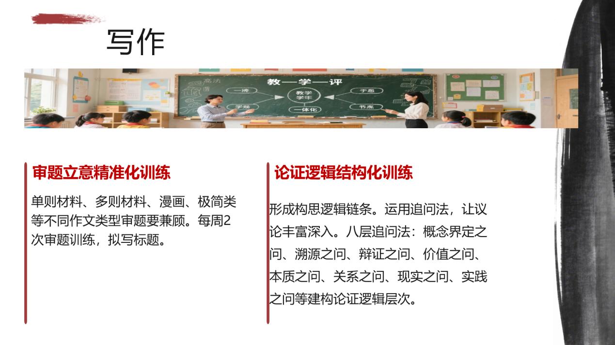 作文是提分重头戏,需遵循审题精准化、逻辑结构化、素材灵活化原则。姜冬霞独创 “六问法” 构建议论文逻辑:通过界定之问锚定核心概念、溯源之问探究多元原因、辩证之问体现思辨性、价值之问升华主题、现实之问贴近生活、践行之问给出具体做法,让文章有深度、有温度。姜老师建议素材积累不必贪多,精选10个涵盖科技、民生、非遗等领域的经典素材即可,更要回归课本,梳理教材28个单元人文主题,将课文素材转化为写作亮点,她直言:“课本是最可靠的素材库。”