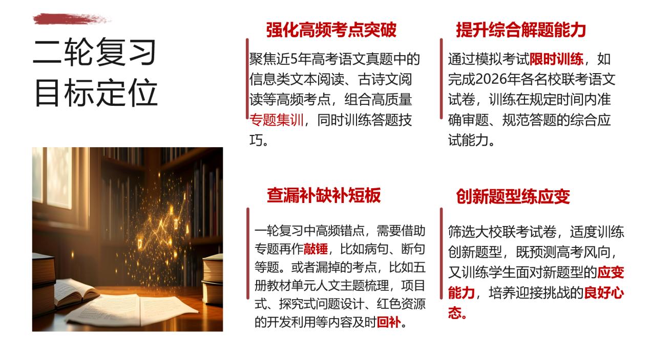 姜冬霞强调,二轮复习是高考语文提分的黄金期,核心目标是强化高频考点、提升综合能力、查漏补缺短板、适应创新题型,需通过科学规划与分模块突破实现精准提分。