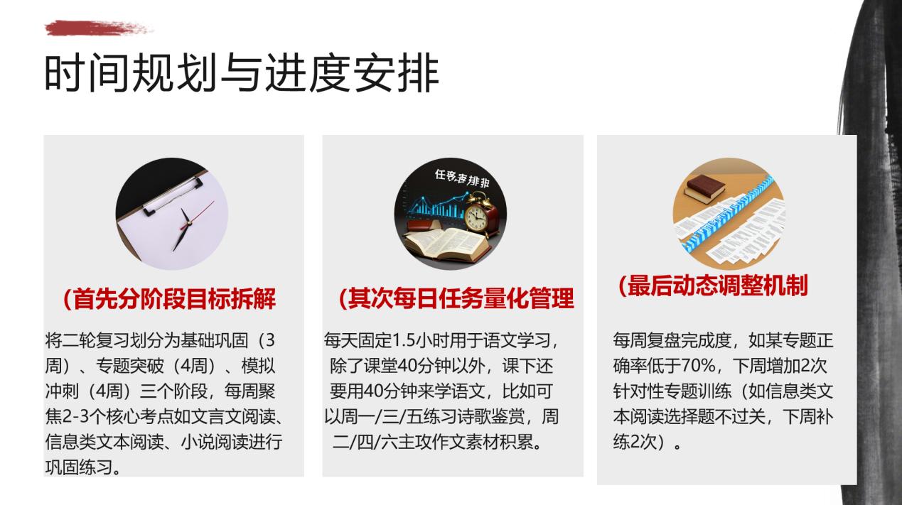 在复习规划上,姜老师提出 “三阶段” 推进法:分为基础巩固(3周)、专题突破(4周)、模拟冲刺(4周)三个阶段。她建议考生每周聚焦 2—3 个核心专题,比如文言文阅读、信息类文本、作文审题等,集中发力逐个攻克。时间安排上,每天保证1.5小时语文学习,课堂40分钟抓重点,课下40分钟补薄弱,可按固定时段分工复习,周一、三、五专攻诗歌鉴赏,周二、四、六积累作文素材。同时需动态调整,每周复盘答题正确率,低于 70% 的专题立即强化训练,确保短板不拖分、强项更稳固。