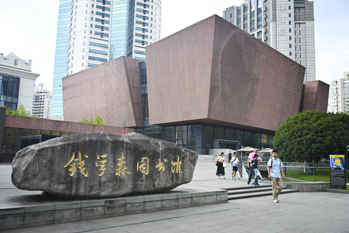 2025年10月6日,观众走出上海交通大学钱学森图书馆。新华社记者 陈浩明 摄