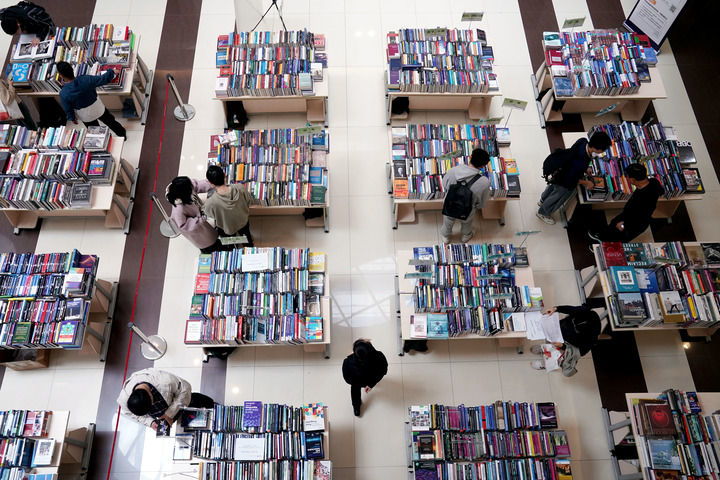 2024年4月23日,读者在上海交通大学图书馆开展丰富多彩的阅读活动,徜徉书海,品味书香。新华社记者 刘颖 摄