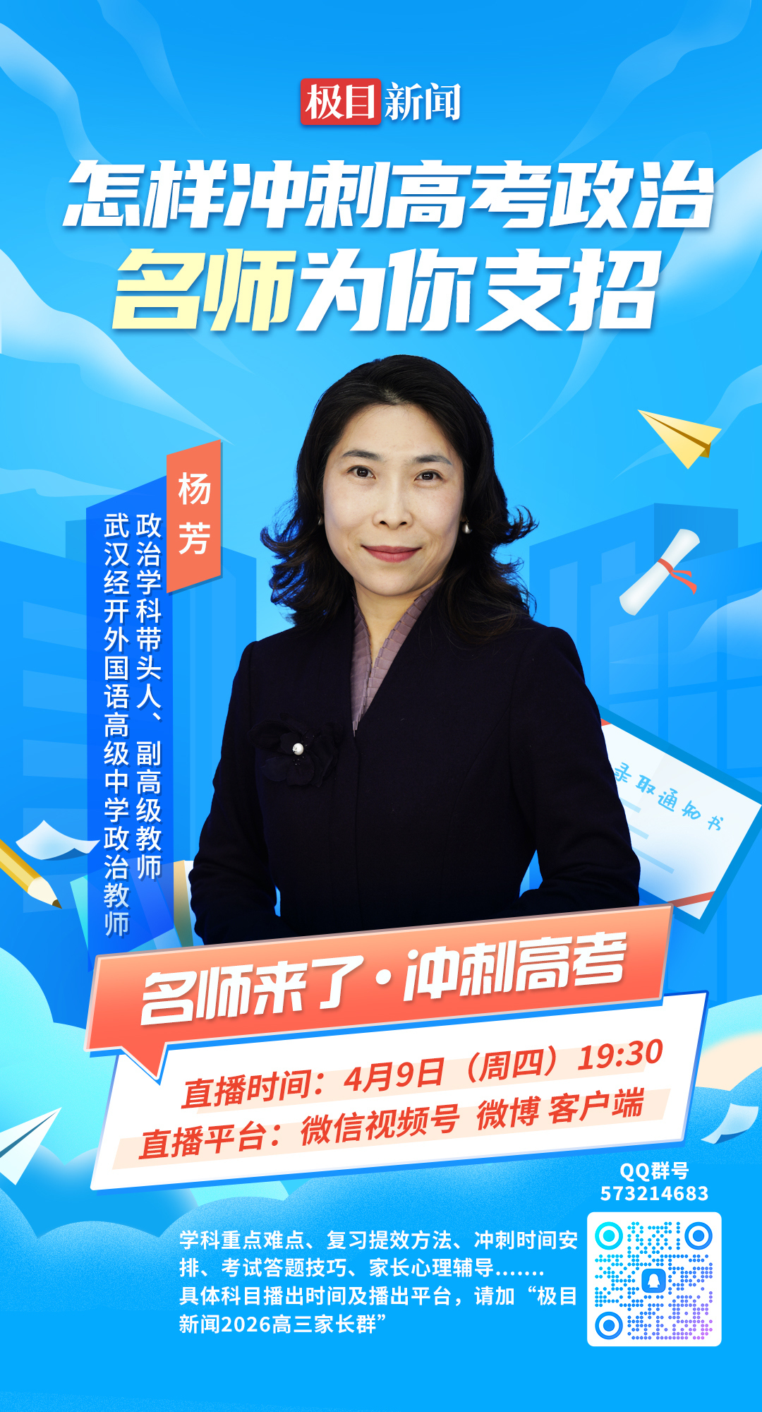 4月9日19:30,新闻“名师来了・冲刺高考”系列公益直播重磅来袭!本次特邀政治学科带头人、副高级教师、武汉经开外国语高级中学政治教师杨芳走进直播间,为广大考生和家长带来政治冲刺复习攻略。