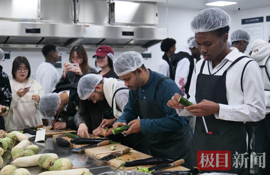 课堂上,原本普通的食材,在精心雕琢下化课堂上,老师们以常见的黄瓜、白萝卜等食材为纸,以刀为笔,将灵动俏皮的国宝形象融入食雕创作。从圆润的身形,到黑白分明的毛色,再到俏皮的神态,老师示范着细腻的刀法与造型技巧。国际学生们目不转睛,小心翼翼地刻划、修整,在一推一拉、一刀一刻之间,尝试还原熊猫的萌态与神韵。