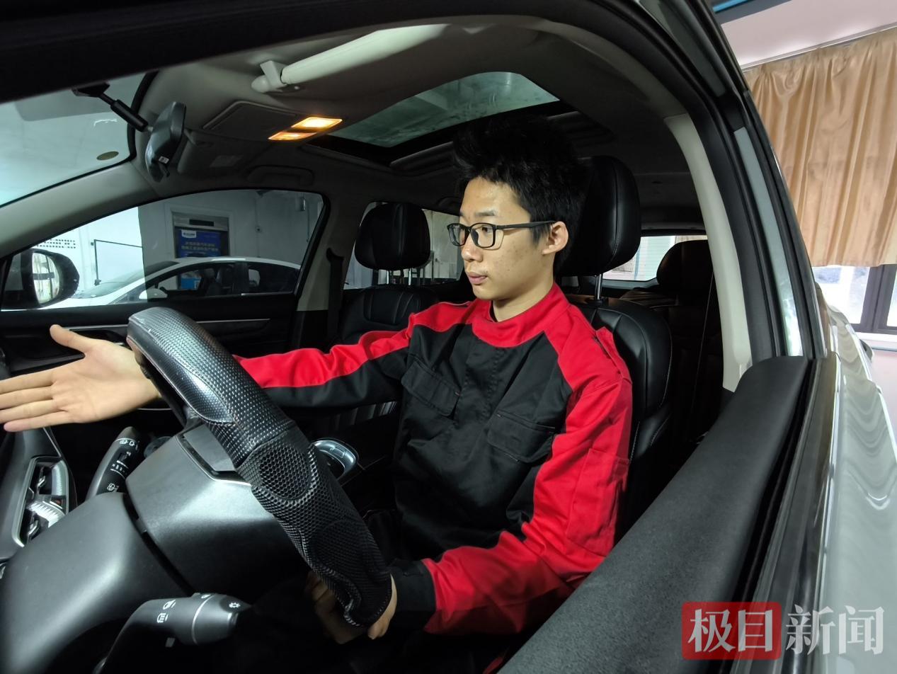 2025年,为冲击省市技能大赛,田嘉禾放弃假期,每天在实训车间训练超10小时。盛夏车间高温难耐,他身着工装蹲在车底排查故障,汗水浸透衣衫;备赛期间,最让他印象深刻的是服务接待赛项:“这个赛项要扮演4S店工作者接待顾客,流程复杂,要记的专业术语特别多,全靠一个人完成,当初练得特别吃力。”