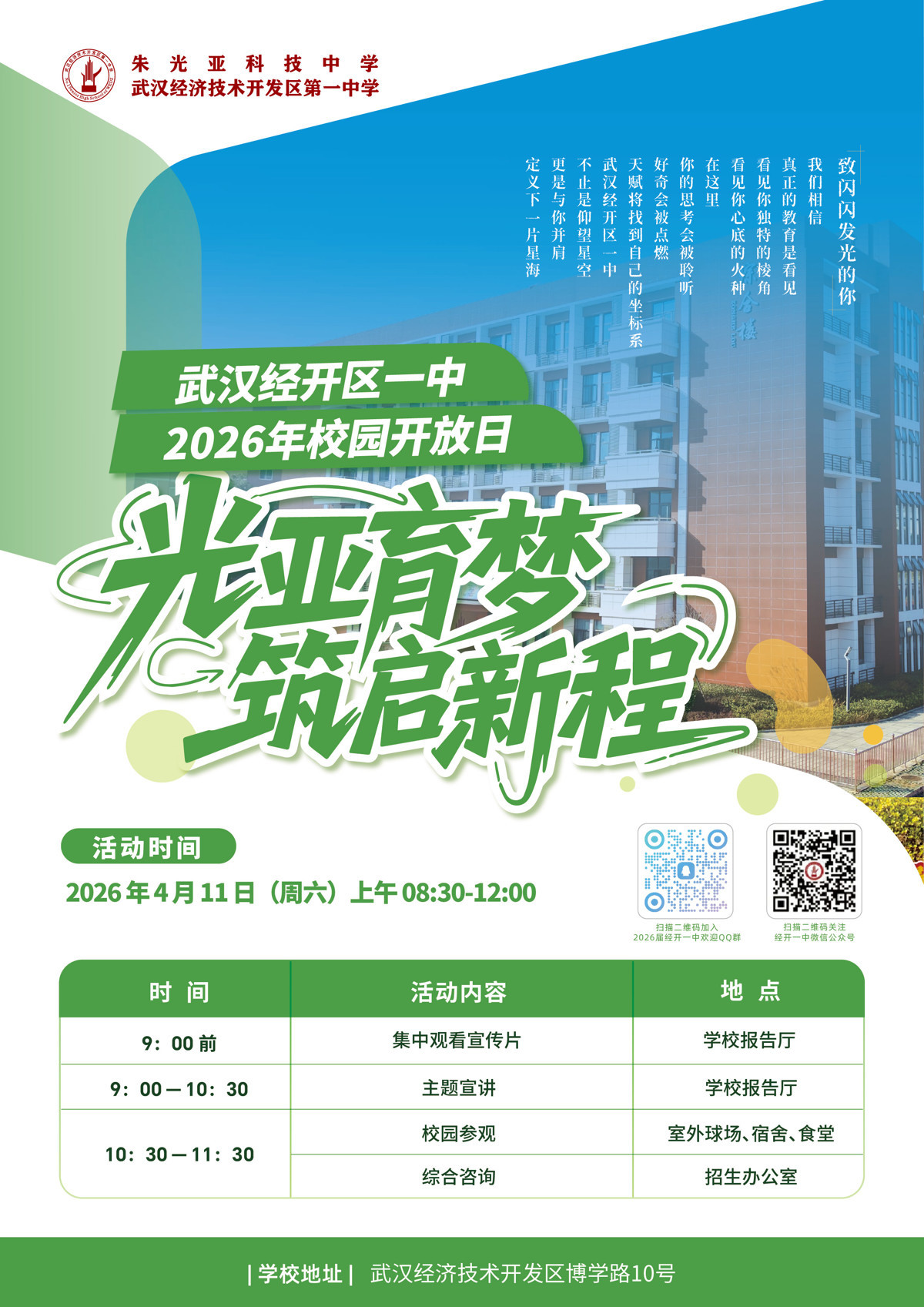 如果你正在为孩子寻找一所“懂他”的学校,不妨明天走进武汉经开区一中。4月11日(周六)上午8:30至12:00,武汉经济技术开发区第一中学(亦称朱光亚科技中学)将举办2026年校园开放日活动,邀请初三学生和家长“零距离”感受这所学校的教育理念与校园生活。