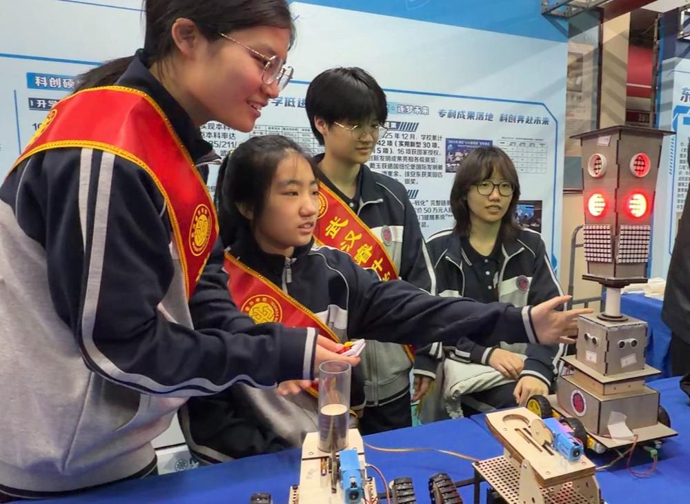 在学校多功能楼报告厅,精彩节目同步上演——华师大临空港实验学校的孩子们编排的科技舞蹈《我们是鲜花》,以艺术诠释科学的力量;武汉睿升学校带来的机器人舞蹈《锐甲律动》,时而轻盈、时而动感,既能跳圆舞曲,也能学叶问打咏春,让人大开眼界。