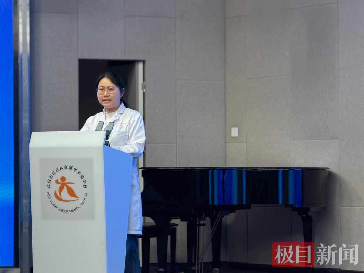 武汉市中心医院眼科医生丁怡代表健康副校长进行了“健康第一课”微宣讲。她现场为学校提供了防控近视、肥胖、脊柱健康的具体方法,希望推动家校社协同发力,实现“启动即履职”。