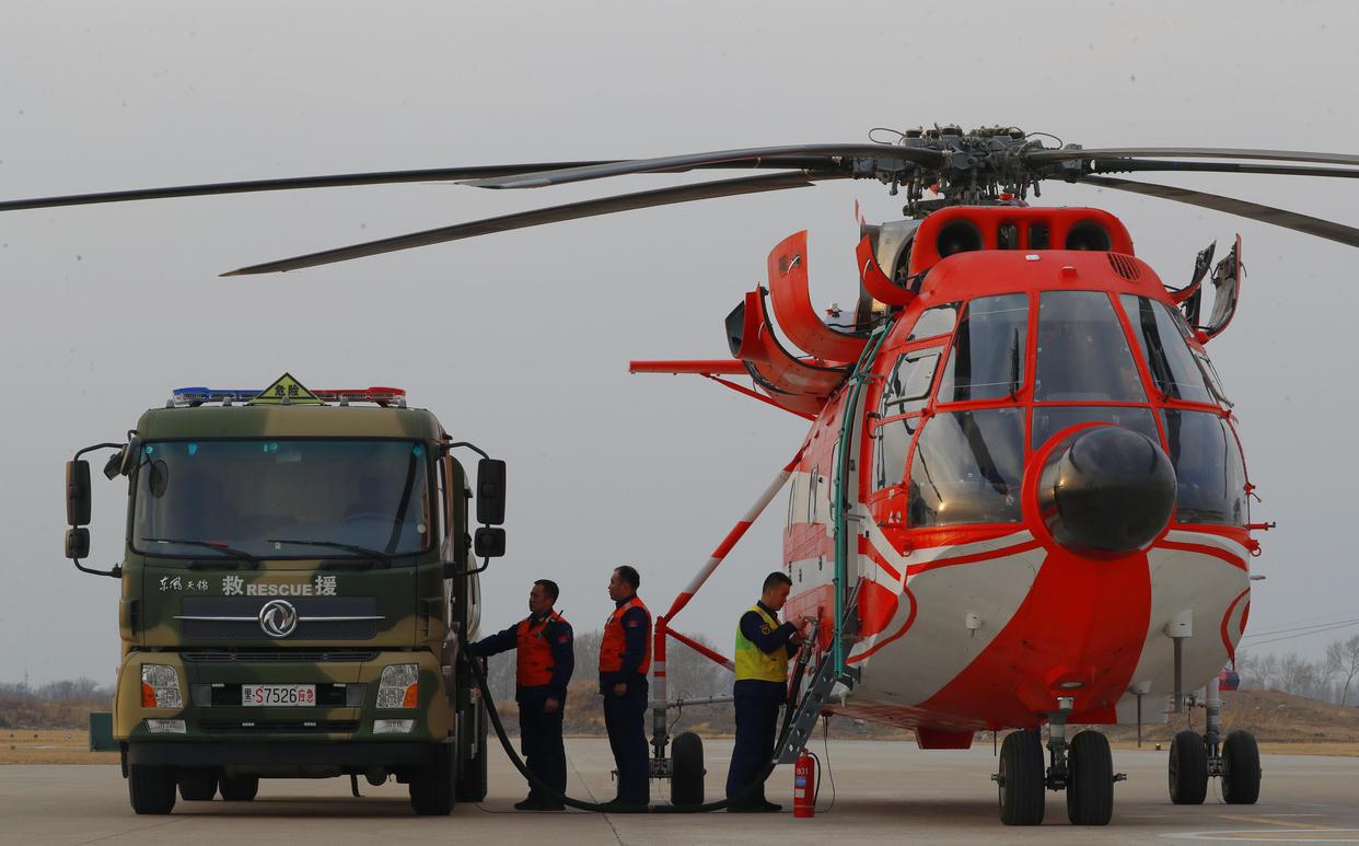 4月15日,在位于黑龙江省大庆市的国家消防救援局大庆航空救援支队跨昼夜救援演练现场,地面保障人员为直升机加注燃油。新华社发(闫安童摄)