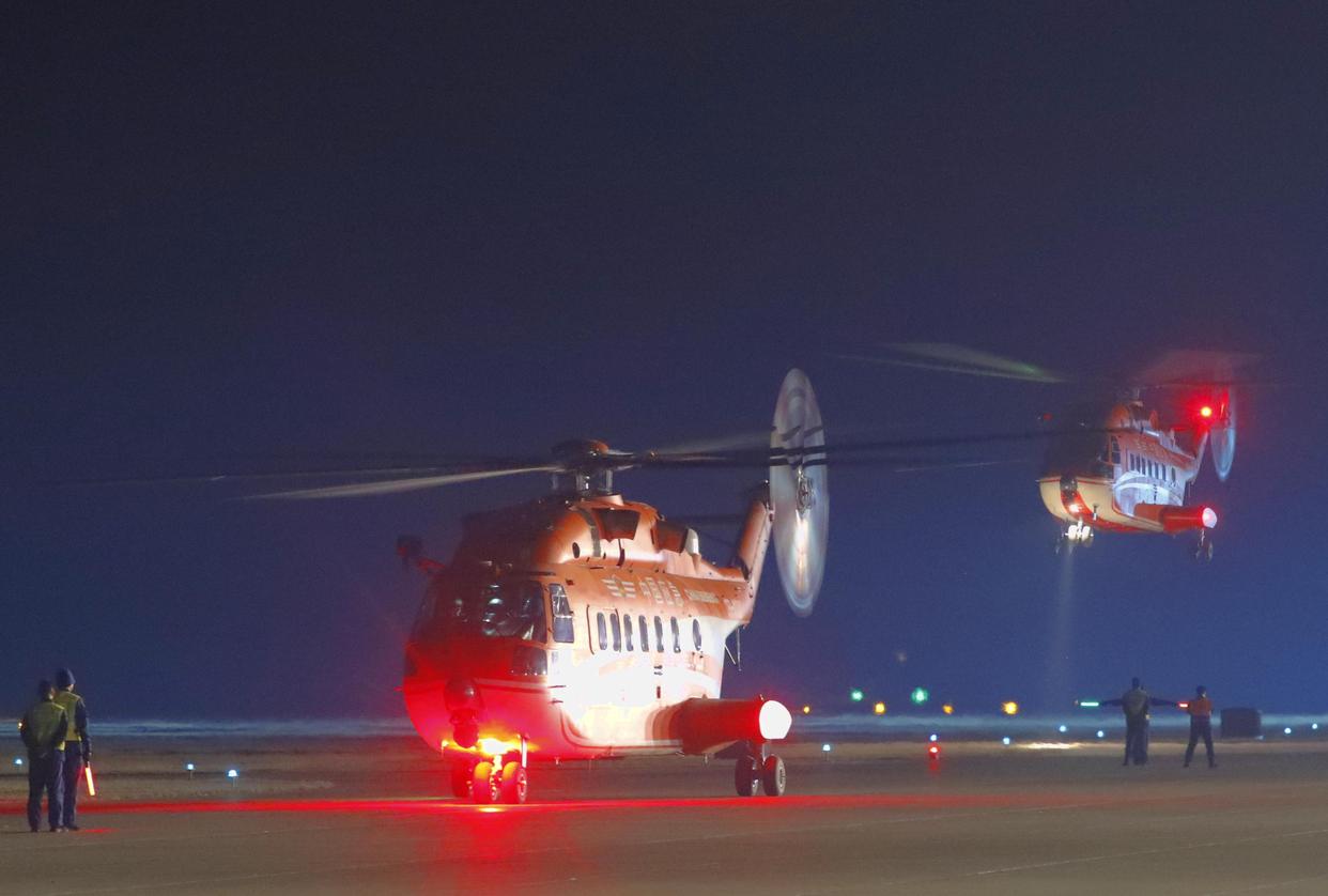 4月15日,在位于黑龙江省大庆市的国家消防救援局大庆航空救援支队跨昼夜救援演练现场,机务保障人员在夜航训练结束后引导直升机降落。新华社发(闫安童摄)