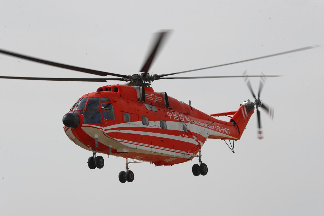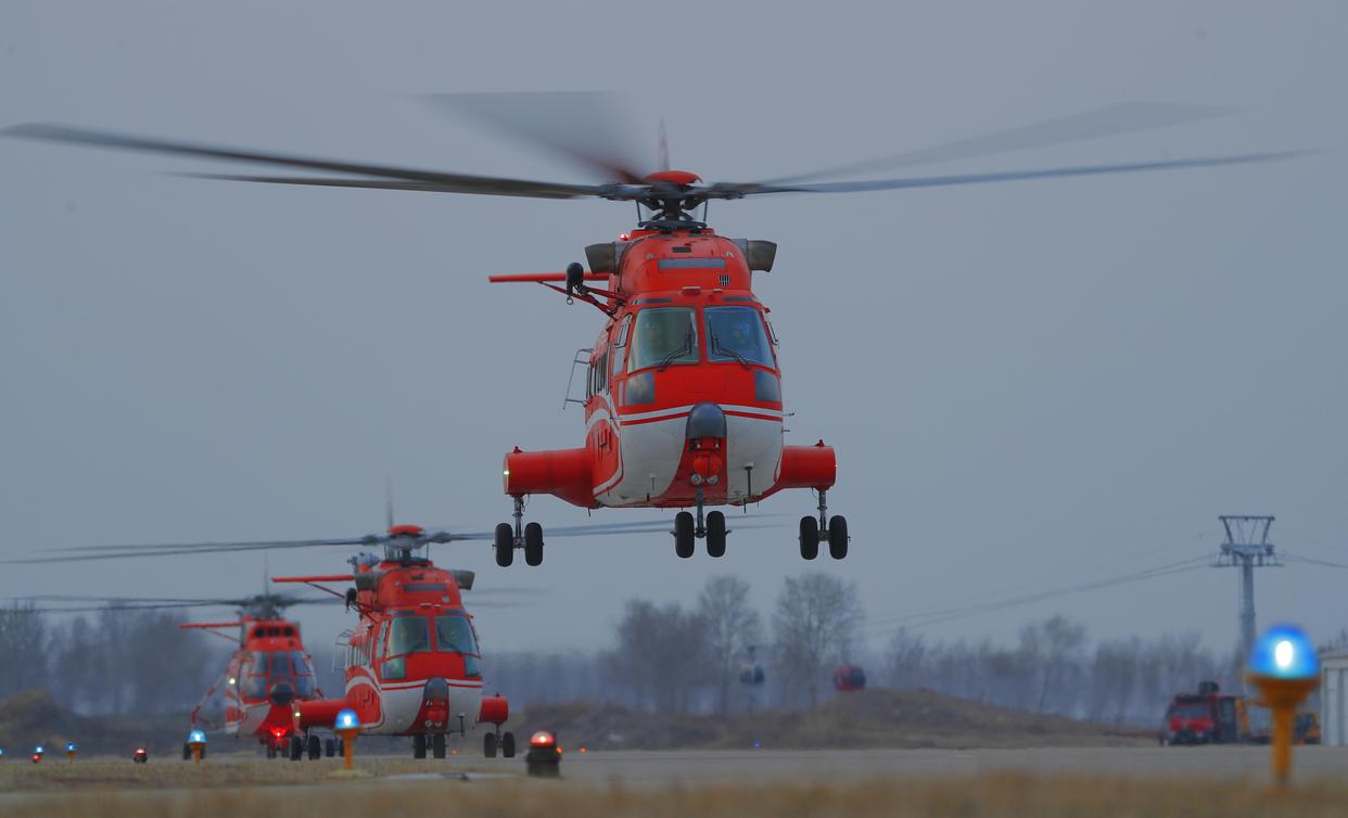 4月15日,在位于黑龙江省大庆市的国家消防救援局大庆航空救援支队跨昼夜救援演练现场,直升机开展飞行演练。新华社发(闫安童摄)