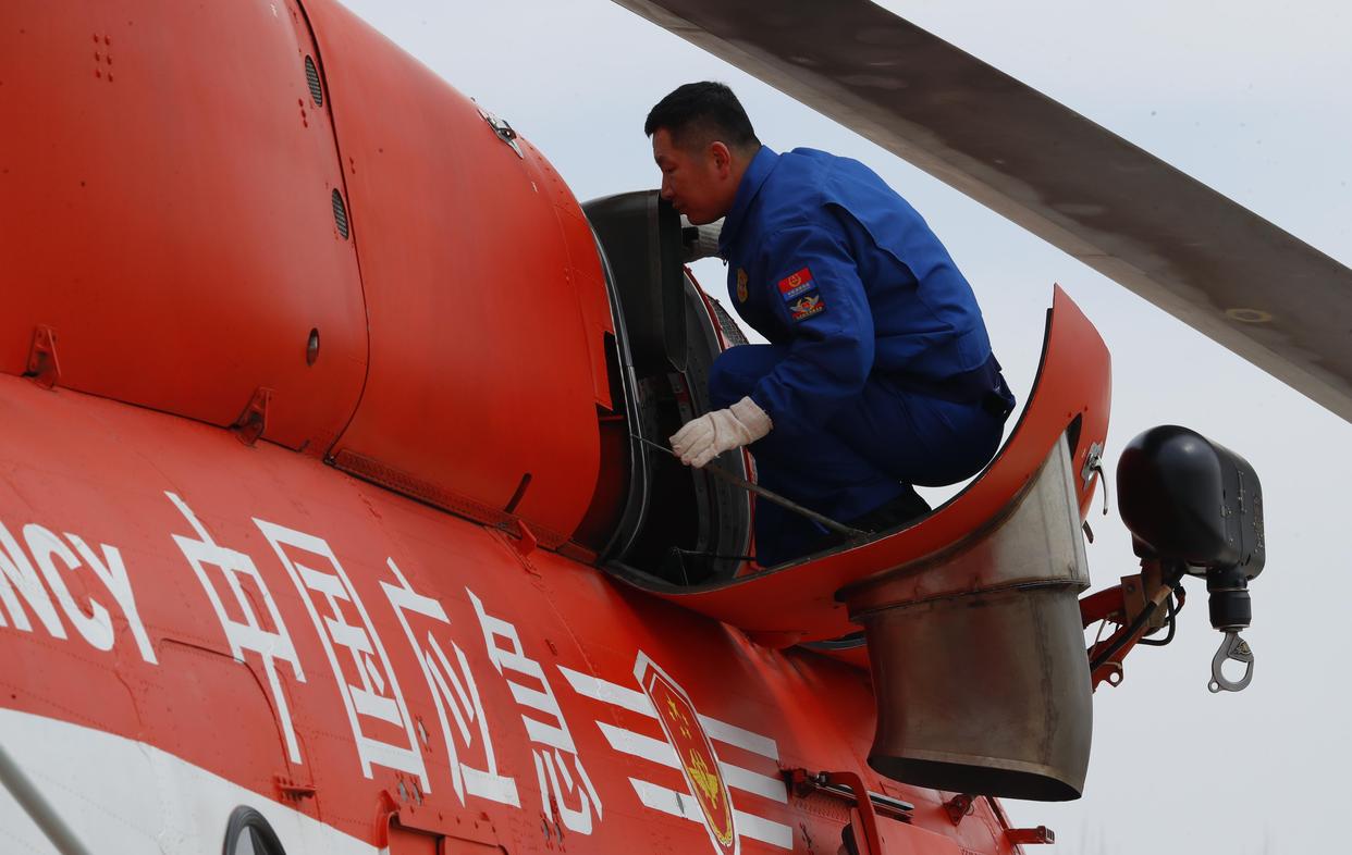 4月15日,在位于黑龙江省大庆市的国家消防救援局大庆航空救援支队跨昼夜救援演练现场,机务保障人员在夜间飞行演练前检查直升机。新华社发(闫安童摄)