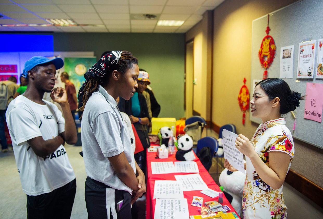4月20日,在博茨瓦纳首都哈博罗内,人们参加博茨瓦纳大学孔子学院举办的“国际中文日”活动。新华社发(策基索·特巴洛摄)
