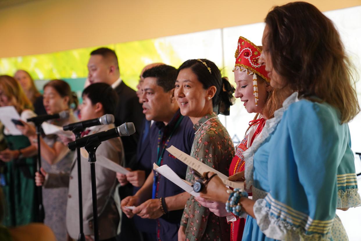 4月20日,在位于纽约的联合国总部,联合国中文语言教学组成员在“国际中文日”庆祝活动上朗诵唐诗。新华社记者 张凤国 摄