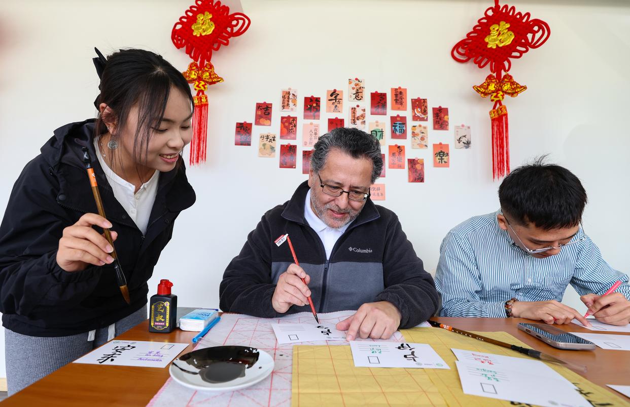 4月20日,在智利南部蓬塔阿雷纳斯的麦哲伦大学孔子学院,人们在“国际中文日”庆祝活动上体验书法。新华社记者 周佳谊 摄
