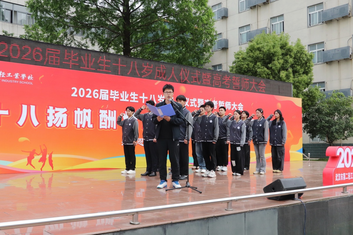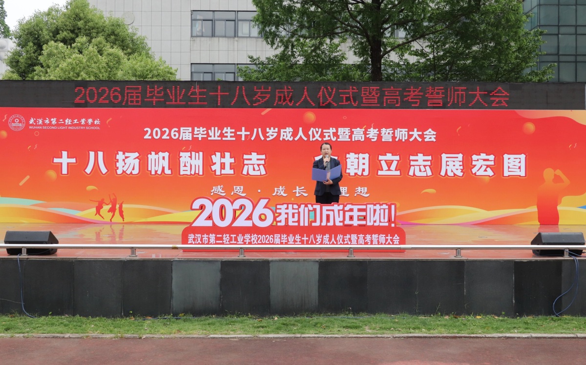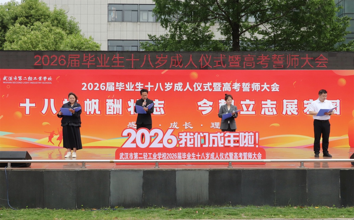 4月20日下午,武汉市第二轻工业学校校园内旗帜飘扬、掌声雷动,2026届毕业生成人仪式暨高考誓师大会如期举行。500余名中职学子在师长与家长的见证下,告别懵懂少年时,以成年人的担当接过高考冲刺的接力棒,在职业教育蓬勃发展的东风中,向着本科梦想全力奔跑。