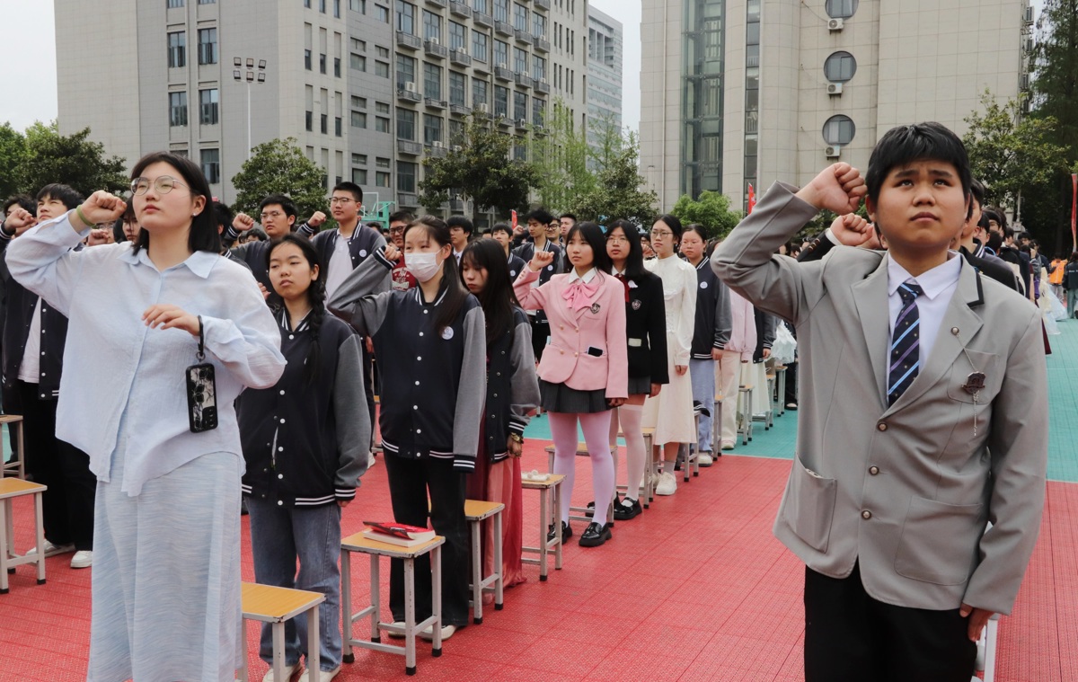 “48天足以实现破茧成蝶的蜕变!”23电商班学生华子涵作为代表发言,青春的誓言铿锵有力。她表示,十八岁的责任将转化为冲刺的动力,在最后的备考时光里勤学苦练、查漏补缺,以优异的高考成绩为成人礼献上首份答卷。学生们高举右拳庄严宣誓,一张张年轻的脸庞上写满坚毅,“此时不搏,更待何时!”的呐喊声回荡在校园上空。