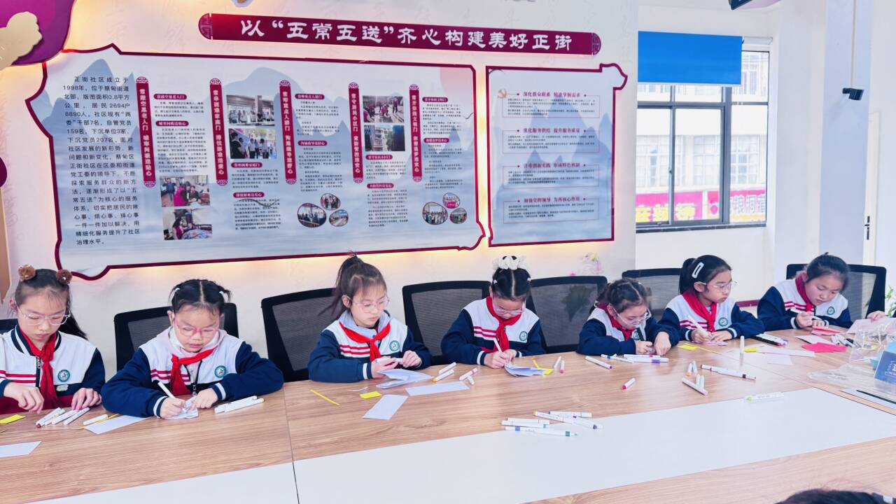 活动最后一个环节是手工制作。社区志愿者们提前准备好了彩纸、剪刀、胶水等材料,指导孩子们围绕“长征精神”“国防强军”“童心向党”等主题进行创意手工。