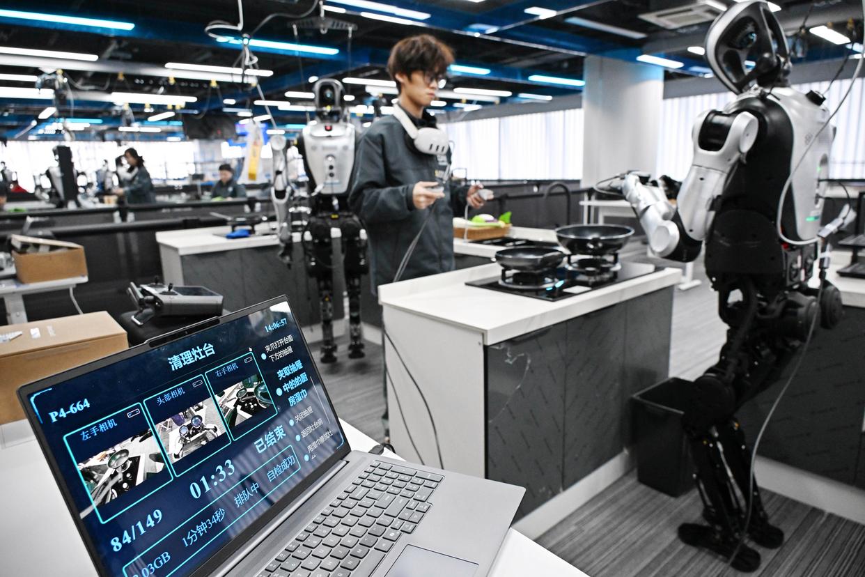 3月23日,在青岛市人形机器人数据采集训练场,训练师在居家收纳场景内指导机器人进行训练。新华社记者 李紫恒 摄