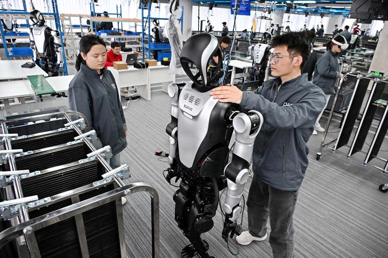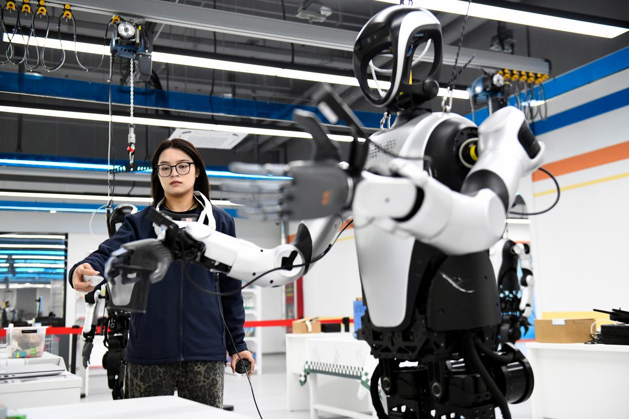 4月22日,在青岛市具身智能机器人公共训练场,训练师在工业巡检场景内指导机器人进行训练。新华社记者 李紫恒 摄