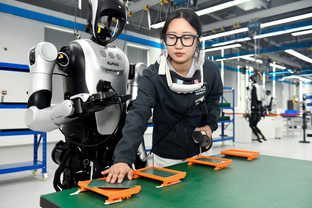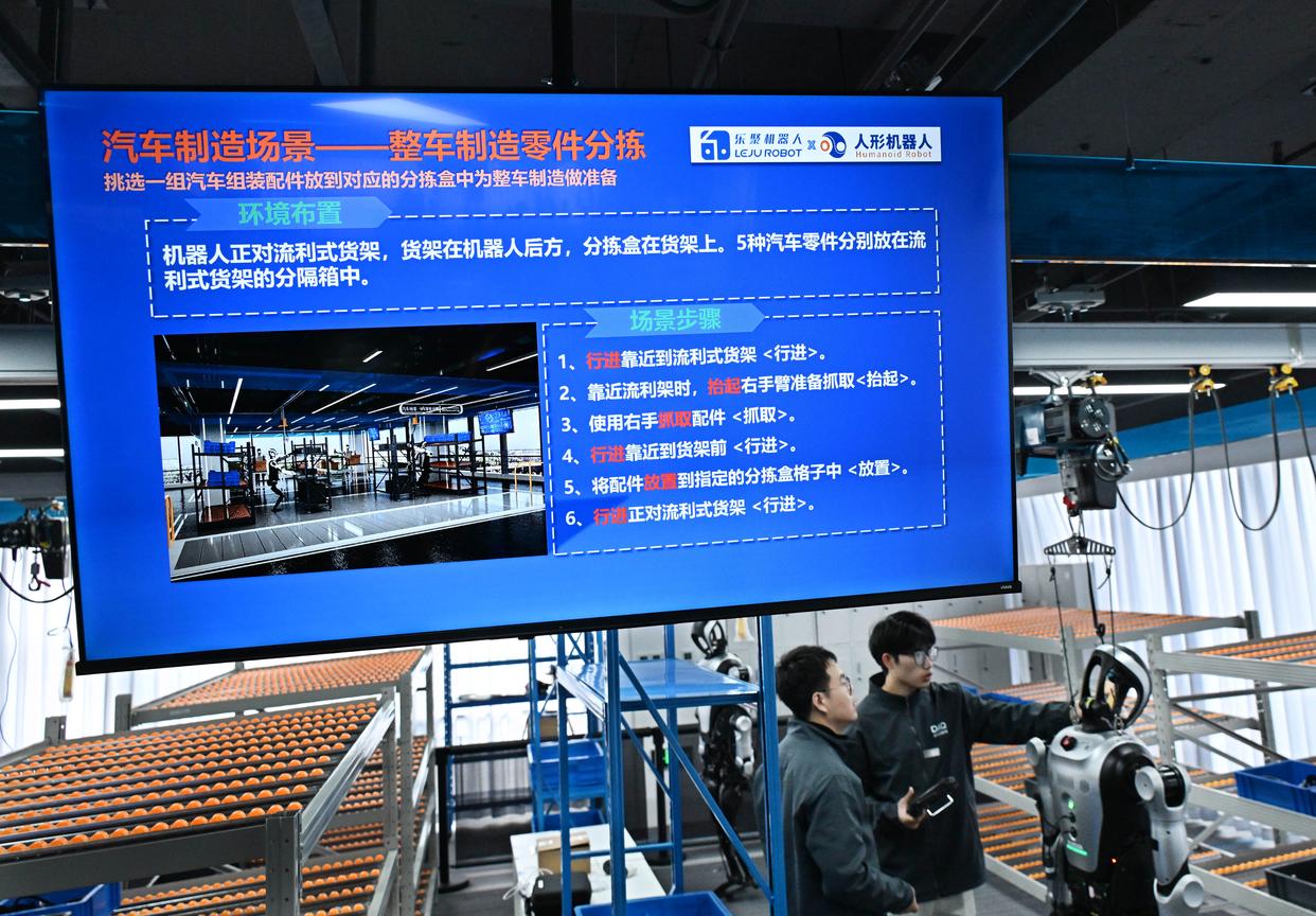 3月23日,在青岛市人形机器人数据采集训练场,训练师在工业生产场景内指导机器人进行训练。新华社记者 李紫恒 摄