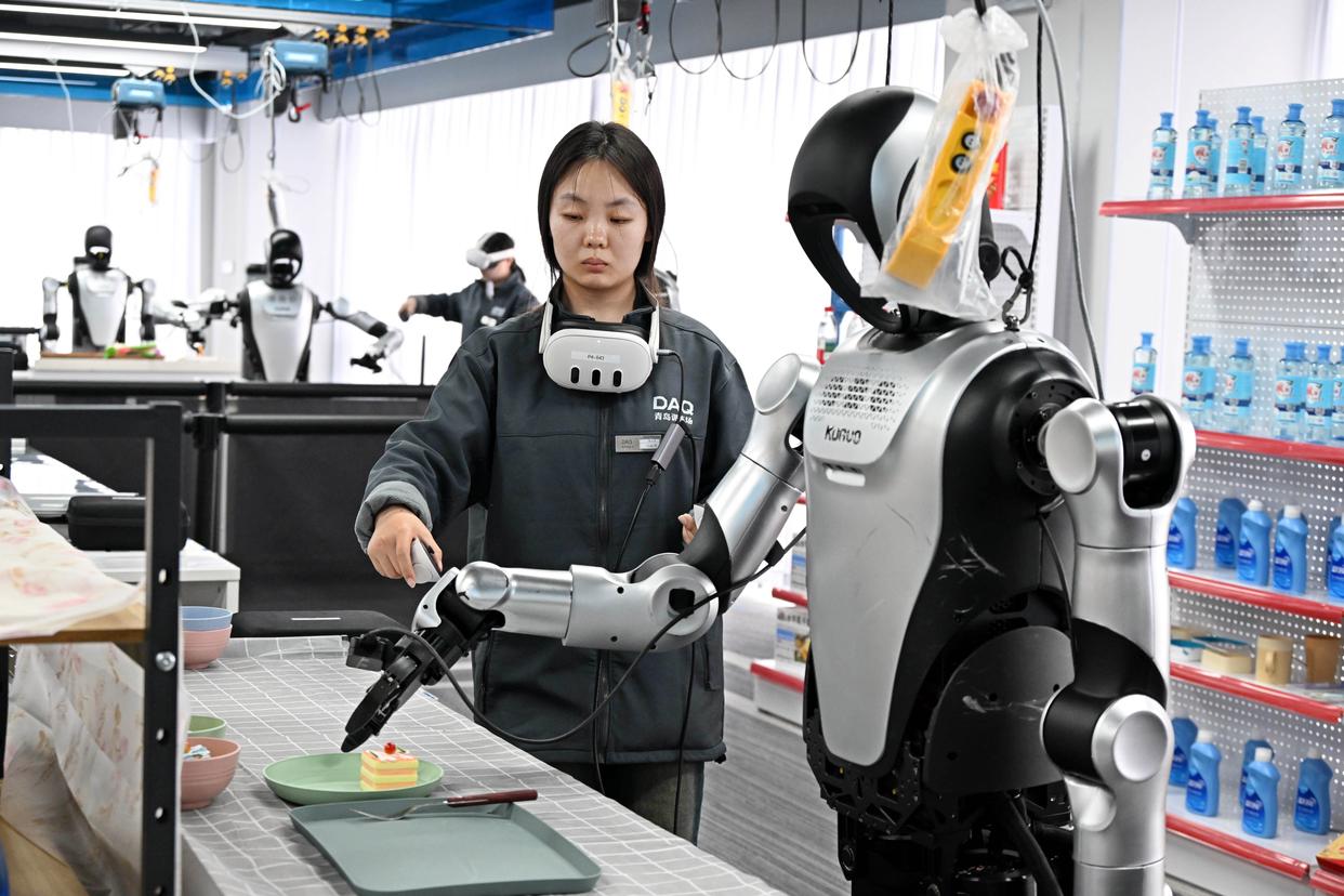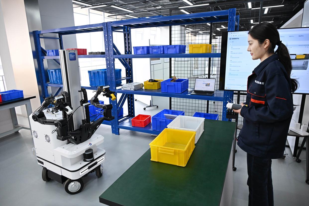 4月22日,在青岛市具身智能机器人公共训练场,训练师马婕在仓储场景内指导机器人训练。新华社记者 李紫恒 摄