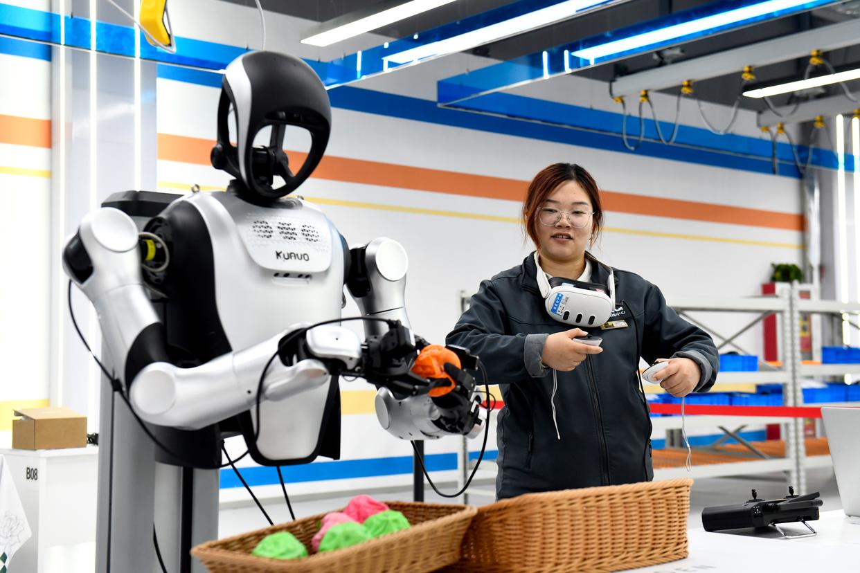 4月21日,在济南市平阴县智创空间孵化园人形机器人数据训练中心,具身智能训练师赵一琳在“生活服务场景——台面清洁”训练机器人。新华社记者 郭绪雷 摄