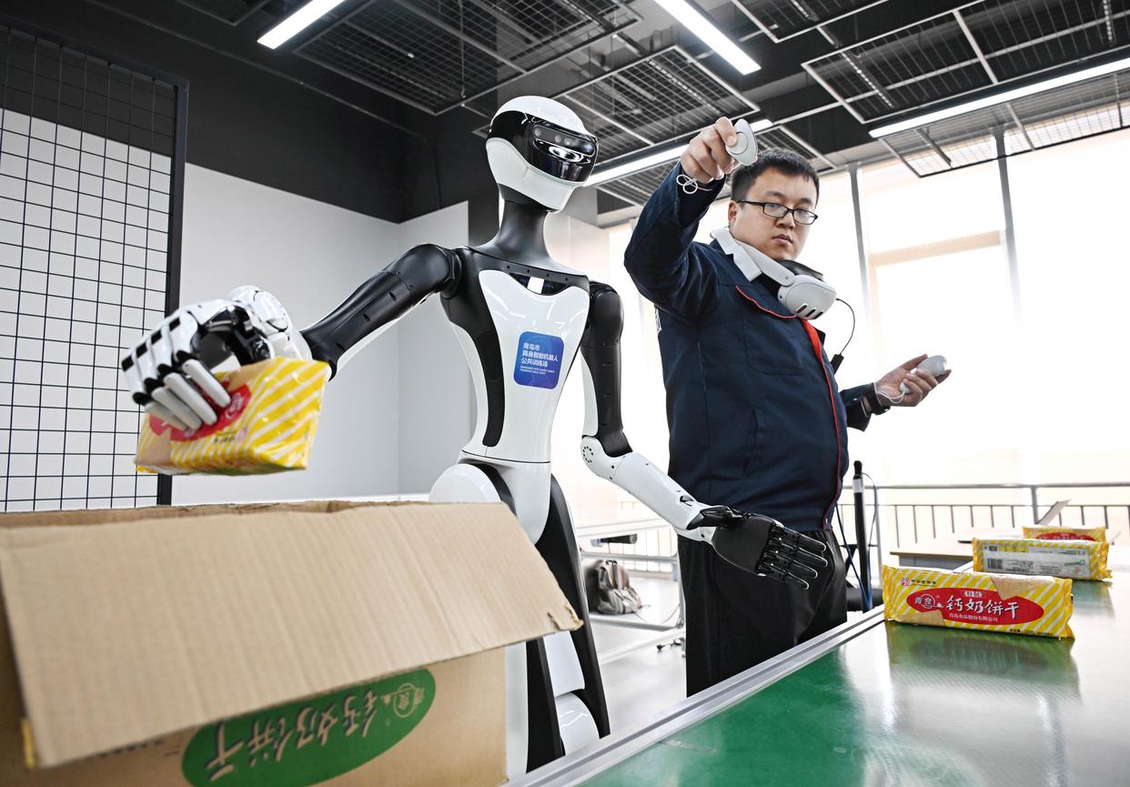 3月23日,在青岛市人形机器人数据采集训练场,训练师在快递物流场景内指导机器人进行训练。新华社记者 李紫恒 摄