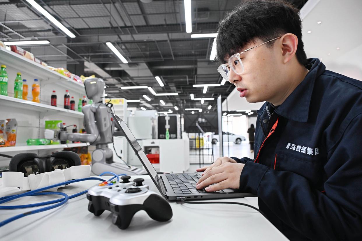 4月22日,在青岛市具身智能机器人公共训练场,训练师王云泽在对采集的数据进行整理。新华社记者 李紫恒 摄