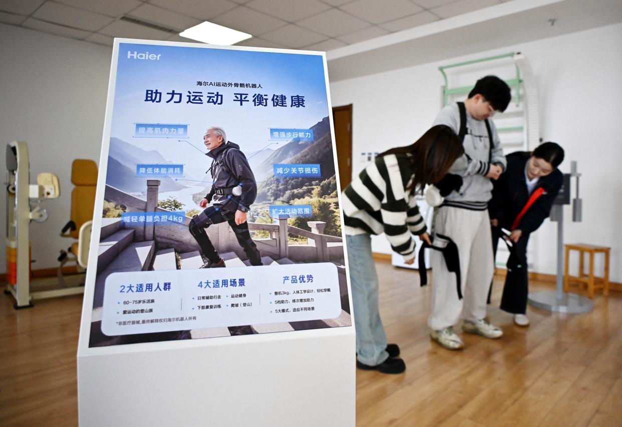 4月9日,在青岛市康养领域具身机器人暨智能康复类产品训练验证中心,训练师在穿戴外骨骼机器人准备训练。新华社记者 李紫恒 摄