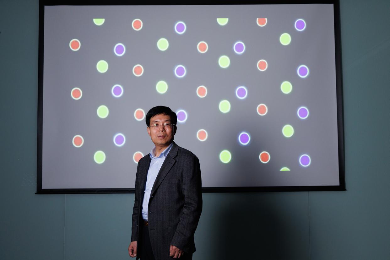 4月20日,中国科学院化学研究所宋延林研究员在打印的光学超材料显微镜实物图前留影。新华社记者 金立旺 摄