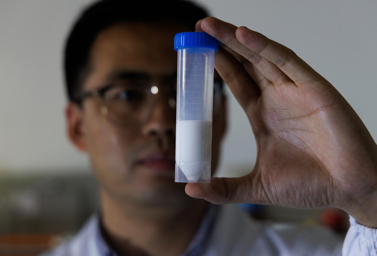 4月20日,在中国科学院化学研究所实验室,李会增副研究员展示用来打印光学超材料的白色乳液。新华社记者 金立旺 摄