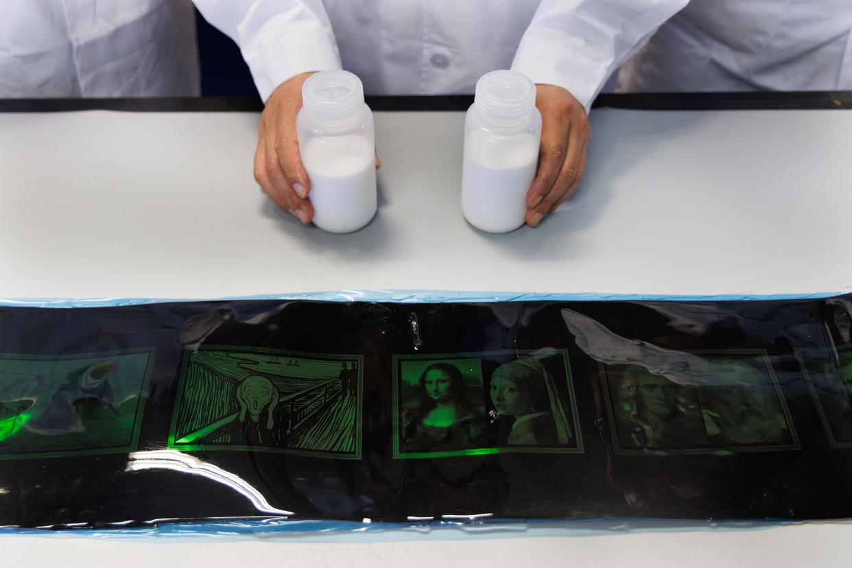 4月20日,在中国科学院化学研究所实验室,宋延林研究员展示用来打印光学超材料的白色乳液和打印出来的材料。新华社记者 金立旺 摄