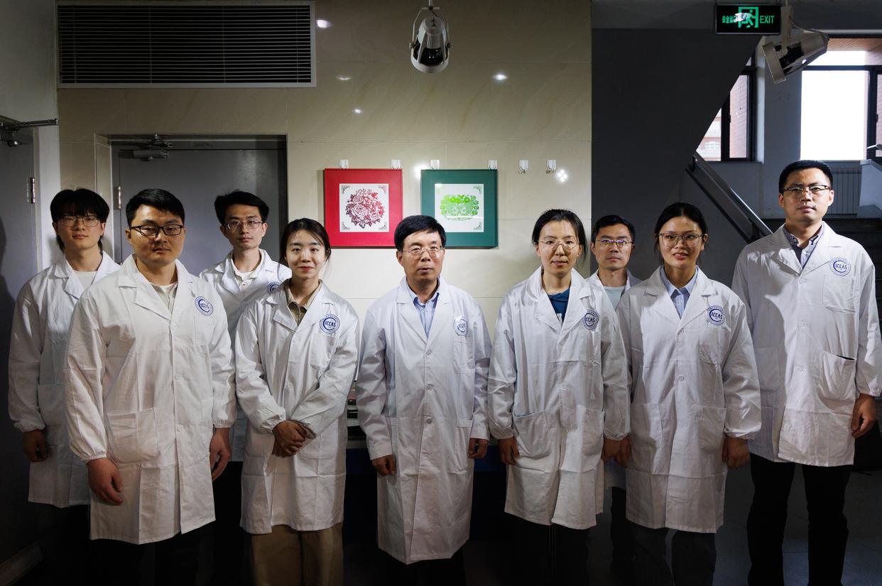 4月20日,在中国科学院化学研究所实验室,宋延林研究员(左五)、李会增副研究员(右一)、李凯旋博士(左二)等团队成员合影。新华社记者 金立旺 摄