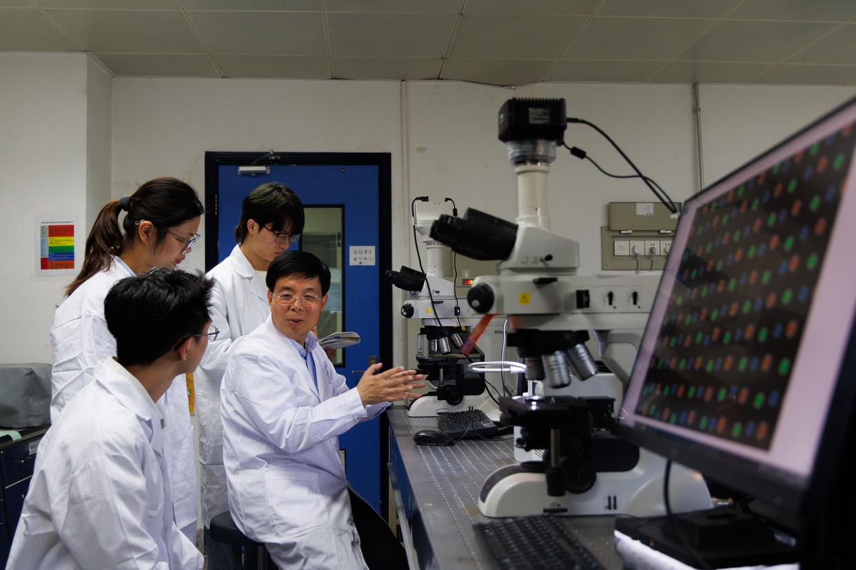 4月20日,宋延林研究员(右一)在中国科学院化学研究所实验室和学生们讨论实验设计。新华社记者 金立旺 摄