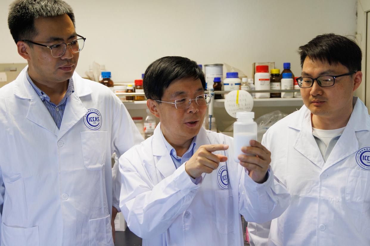 4月20日,在中国科学院化学研究所实验室,宋延林研究员(中)、李会增副研究员(右)、李凯旋博士合影。新华社记者 金立旺 摄