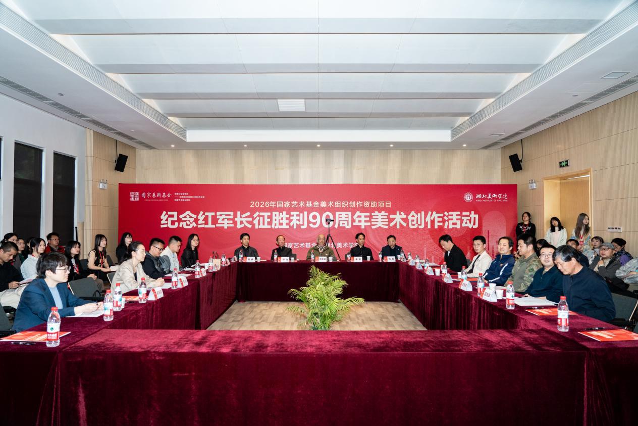 4月20日,“纪念红军长征胜利90周年美术创作活动”国家艺术基金美术创作项目启动仪式在湖北武汉汤湖美术馆举行。著名长征题材画家、连环画《地球的红飘带》作者、中国人民大学教授沈尧伊,中国美协连环画艺委会主任李晨,版画家、云南艺术学院原院长郭浩,新疆生产建设兵团美协名誉主席尤山,人民美术出版社连环画编辑室主任何玉麟,第十四届全国美展金奖获得者、中国美术学院副教授洪万里,第十四届全国美展银奖获得者、广州美术学院教授沈璐,第十三届全国美展铜奖获得者、鲁迅美术学院教师李非,中国人民解放军军事科学院研究员褚银,军旅画家李明峰,中国人民解放军新闻传播中心编辑邵景院等专家;湖北美术学院副院长张炼,党委常委、副院长、项目负责人曹丹,绘画学院院长徐文涛,湖北美术学院中国红色美术文化研究中心副主任、马克思主义学院教授吴继金,湖北美术学院各教学单位、部门负责人,师生代表以及项目成员代表出席活动。