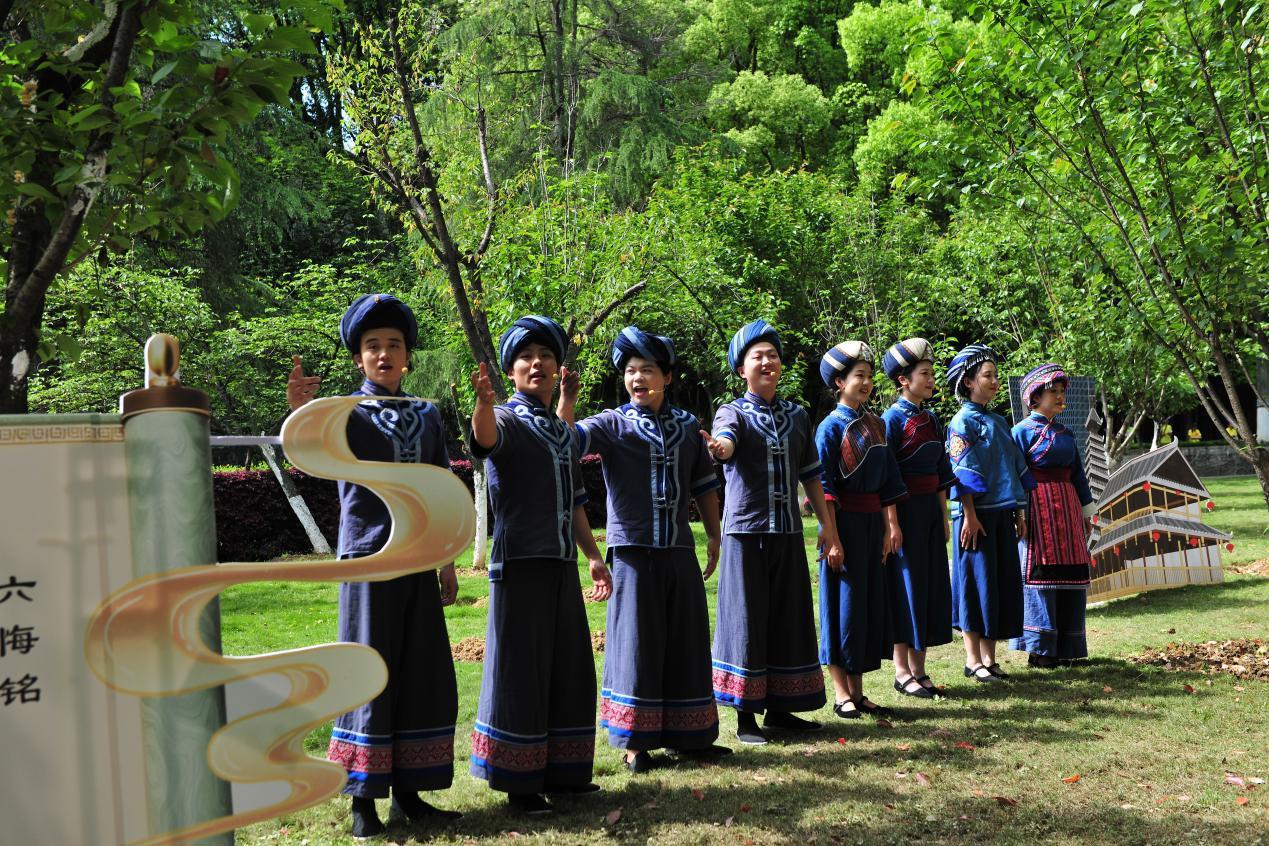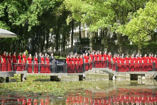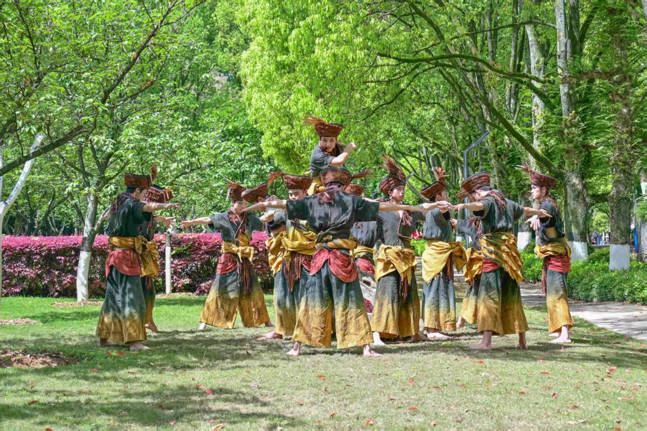在唐宋篇章中,吟诵《把酒问月》再现了李白流放夜郎途经施州的豪迈诗情,女子群舞《露华浓》《只此风雅》以曼妙舞姿演绎古典韵味。民大师生还将宋代名臣寇准名篇《六悔铭》与恩施本土民歌《六口茶》有机融合,创编出修身励志歌曲《人生无悔六口茶》,以优美的旋律承载立德修身的内涵,激起师生深深共鸣。