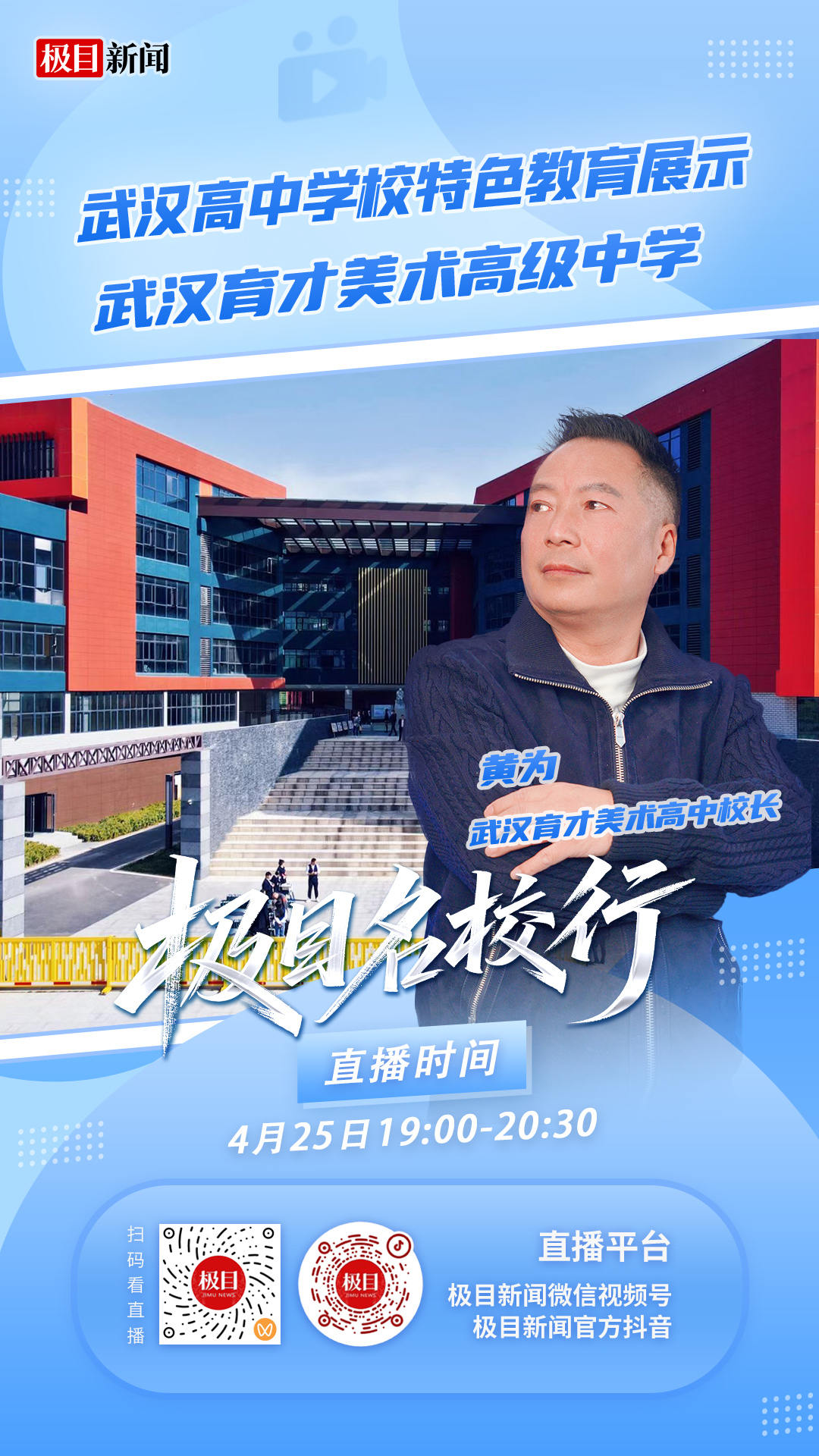 中考招生季,如何选择优质艺术特色高中?为服务广大考生和家长,楚天都市报新闻特别推出“名校行·2026年武汉高中学校特色展示”节目,邀请一批优质学校的校长、招生负责人做客直播间,帮助初三学生和家长更全面地了解学校和中考政策。4月25日(周六)19:00-20:30,武汉育才美术高中校长黄为将做客名校行,向广大考生和家长介绍武汉育才美术高中的独特魅力,同时为广大考生和家长权威解读艺术升学与择校关键信息。